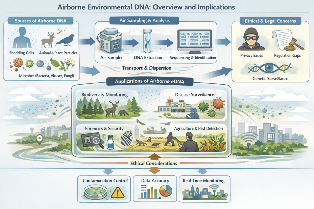 Airborne environmental DNA; eDNA; molecular ecology; biodiversity monitoring; aerosolized DNA; metagenomics; bioaerosols; environmental surveillance; genetic privacy; forensic genomics